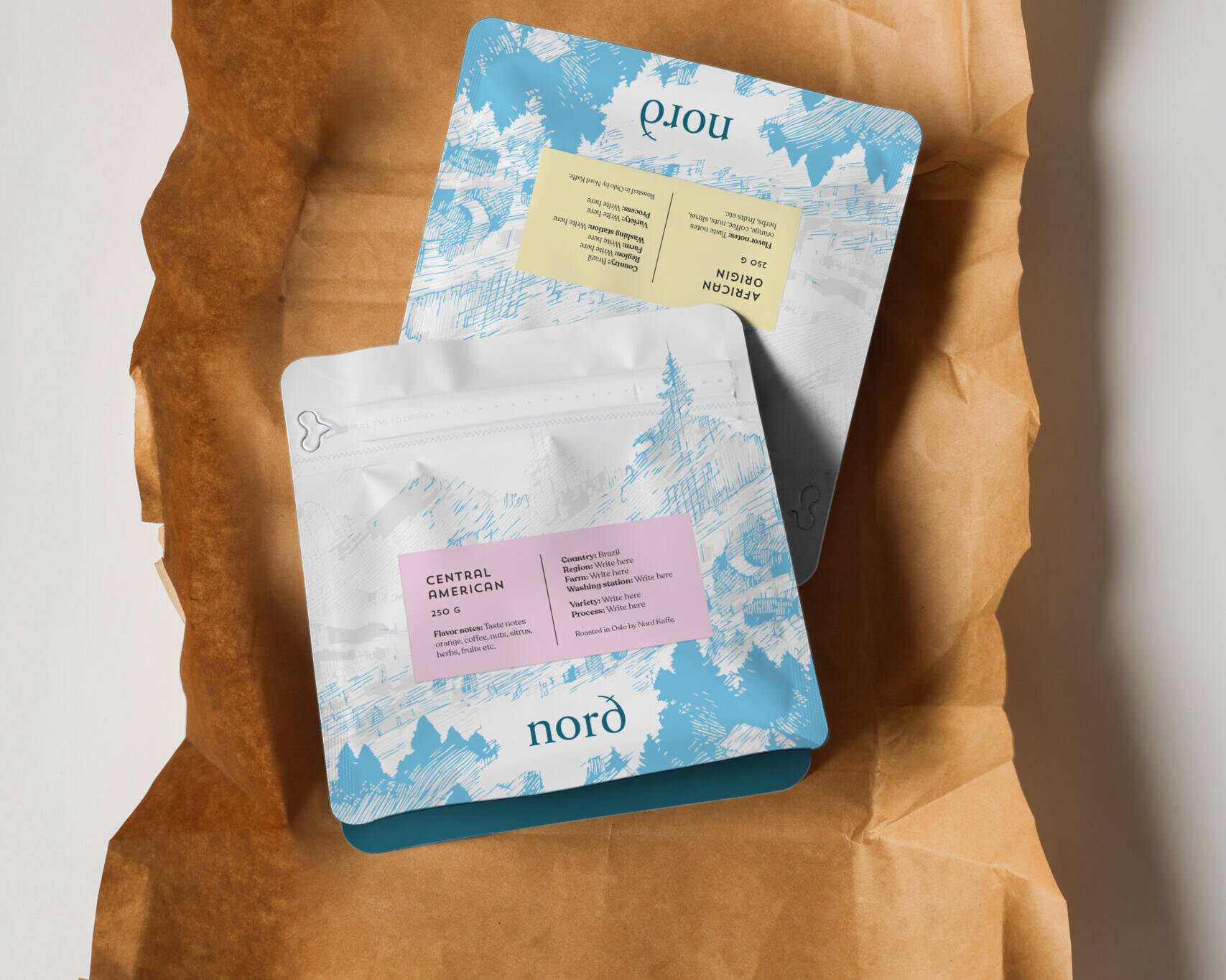 Vi endte opp med å utvikle et sett med illustrasjoner av nordiske skogslandskap. Illustrasjonene skaper liv og dybde i bakgrunnen, mens etiketter i livlige pastellfarger blir det ekstra krydderet og setter «prikken over i-en». Materialet på posene var viktig, og vi har lagt på flere spennende detaljer for å få posene til å speile den høye kvaliteten på innholdet. Logosymbolet ligger med blank spotlakk på sidene, det er spotlakk på logo på forsiden og hele posen er matt og med en såkalt «soft touch». Formatet er også blitt modernisert.